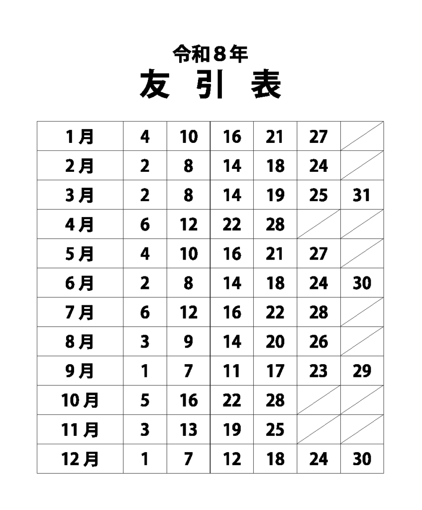 2026(令和8)年 友引表
