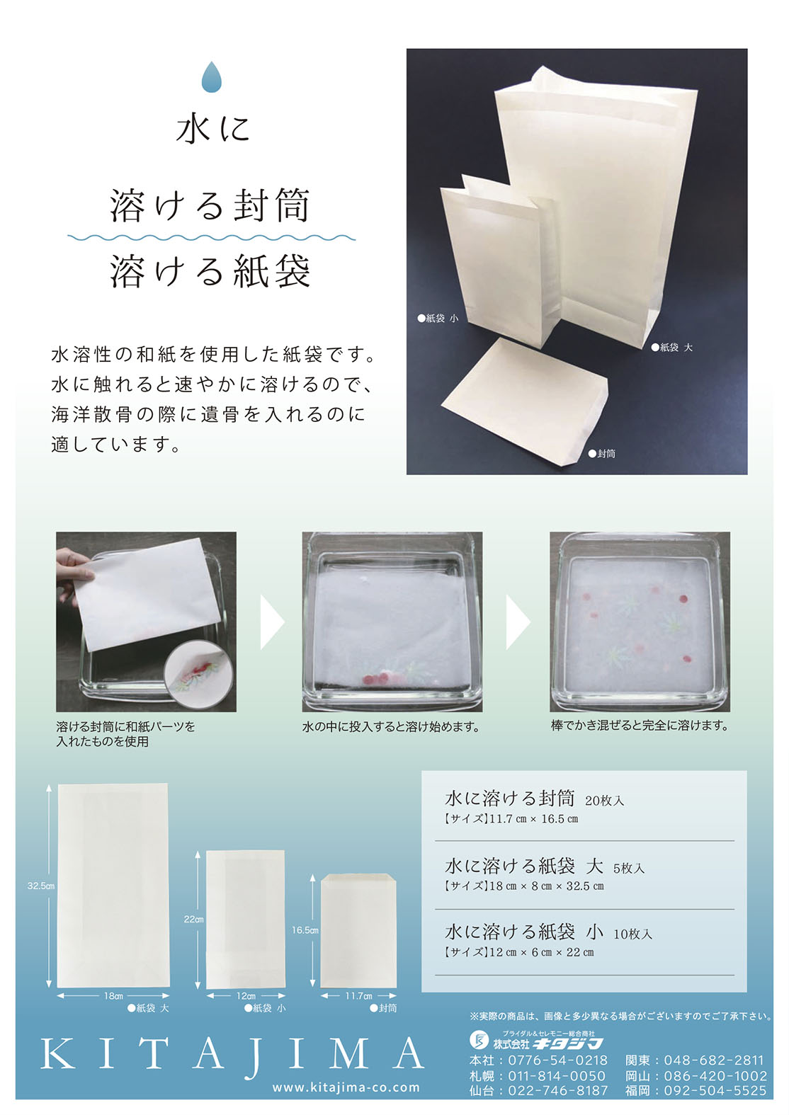 水に触れると速やかに溶けるので、海洋散骨の際に遺骨を入れるのに 適しています。